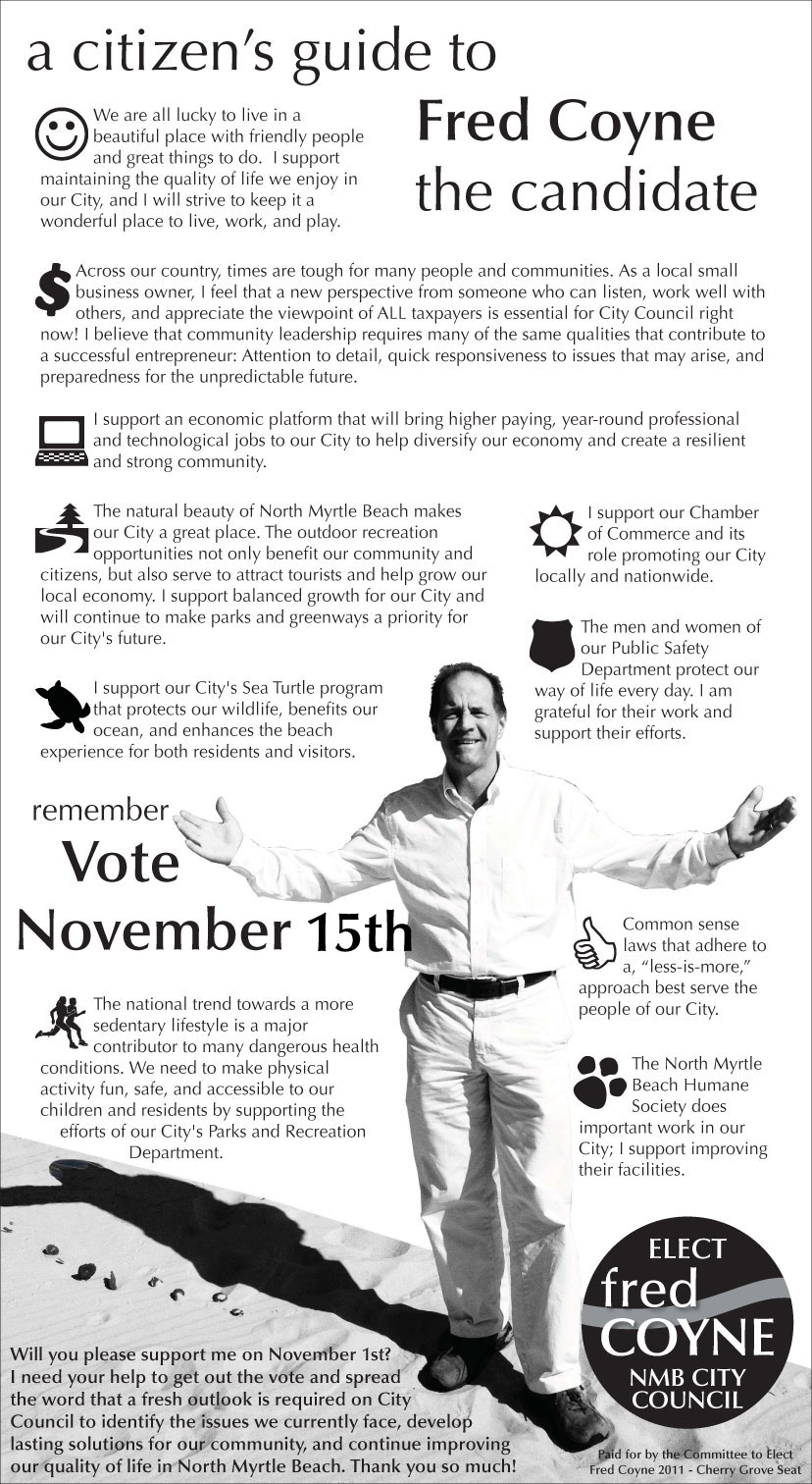 My name is Fred Coyne, and I’m asking for your vote on November 15th. I’d like to explain why I’m running for City Council. As a father and husband living in North Myrtle Beach since 1986, I see the need to move our city forward. For the past 4 years, I’ve been Chairman of the NMB Planning Commission and a member for the past 8 years, so I have a clear understanding of the issues facing our City. Additionally, as a local business owner, I feel that a new perspective from someone who can listen, work well with others, and appreciate the viewpoint of ALL taxpayers is essential for City Council right now!